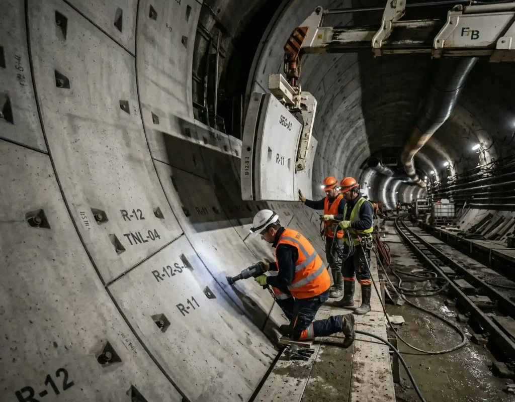 Precast Concrete Segmental Lining: Prefabricated tunnel lining rings assembled within the TBM shield by the erector. Each ring comprises multiple precast concrete segments bolted or compression-fitted together. The dominant lining system for mechanised TBM tunnel construction and bored tunnels.