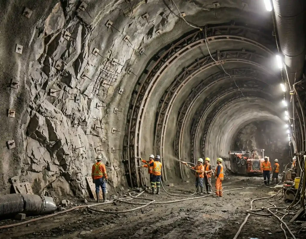 Tunnel excavation and lining: Drill-and-blast and mechanised excavation of hard rock and soft ground tunnels, including primary support installation, waterproofing, and permanent lining construction.